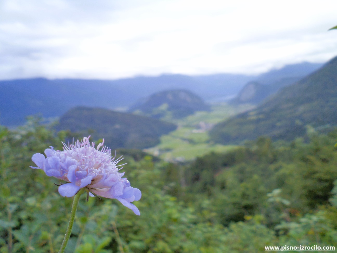 Na Koprivniku je danes postavljen Vodnikov razglednik, ki opominja na pesnikovo očaranost nad bohinjsko naravo. Ko sem ga obiskala prvič, je bil razgled na bohinjske hribe zaradi oblačnega vremena nekoliko okrnjen. Osredotočila sem se na makro posnetek tega cveta, ki verjetno pripada vrsti njivsko grabljišče.