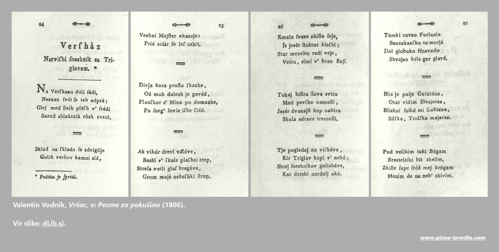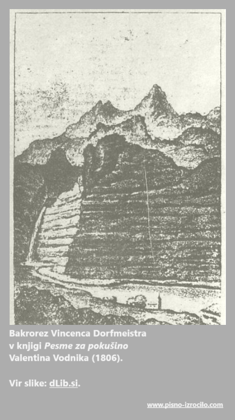 Sliki Dorfmeistrovega bakroreza in Vodnikove pesmi Vršac: Valentin Vodnik, Pesme sa pokušino, 1806, povezava.