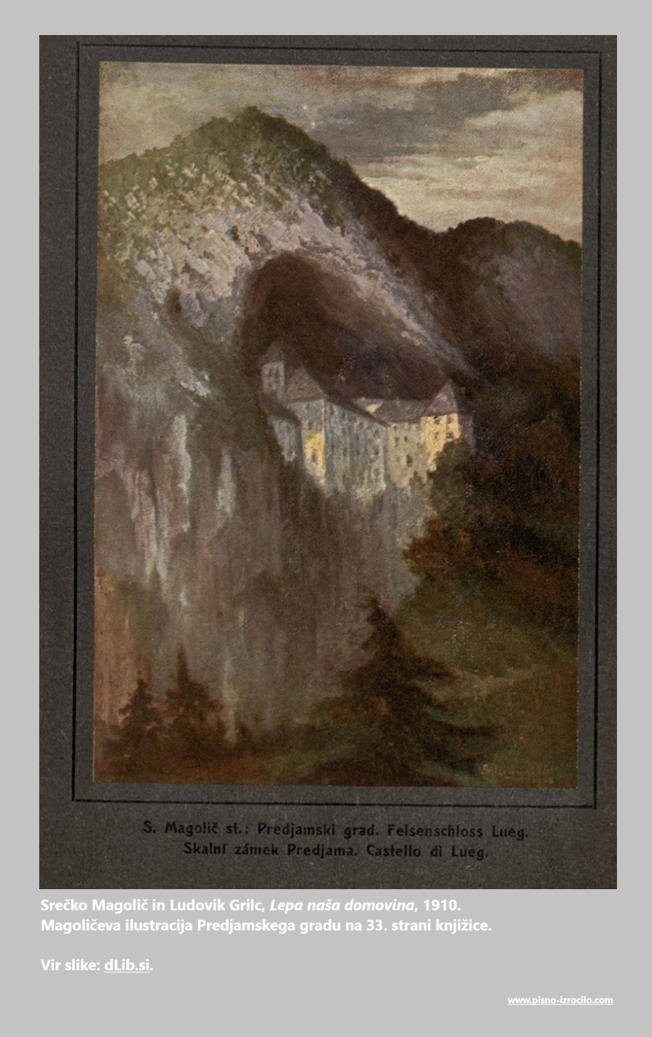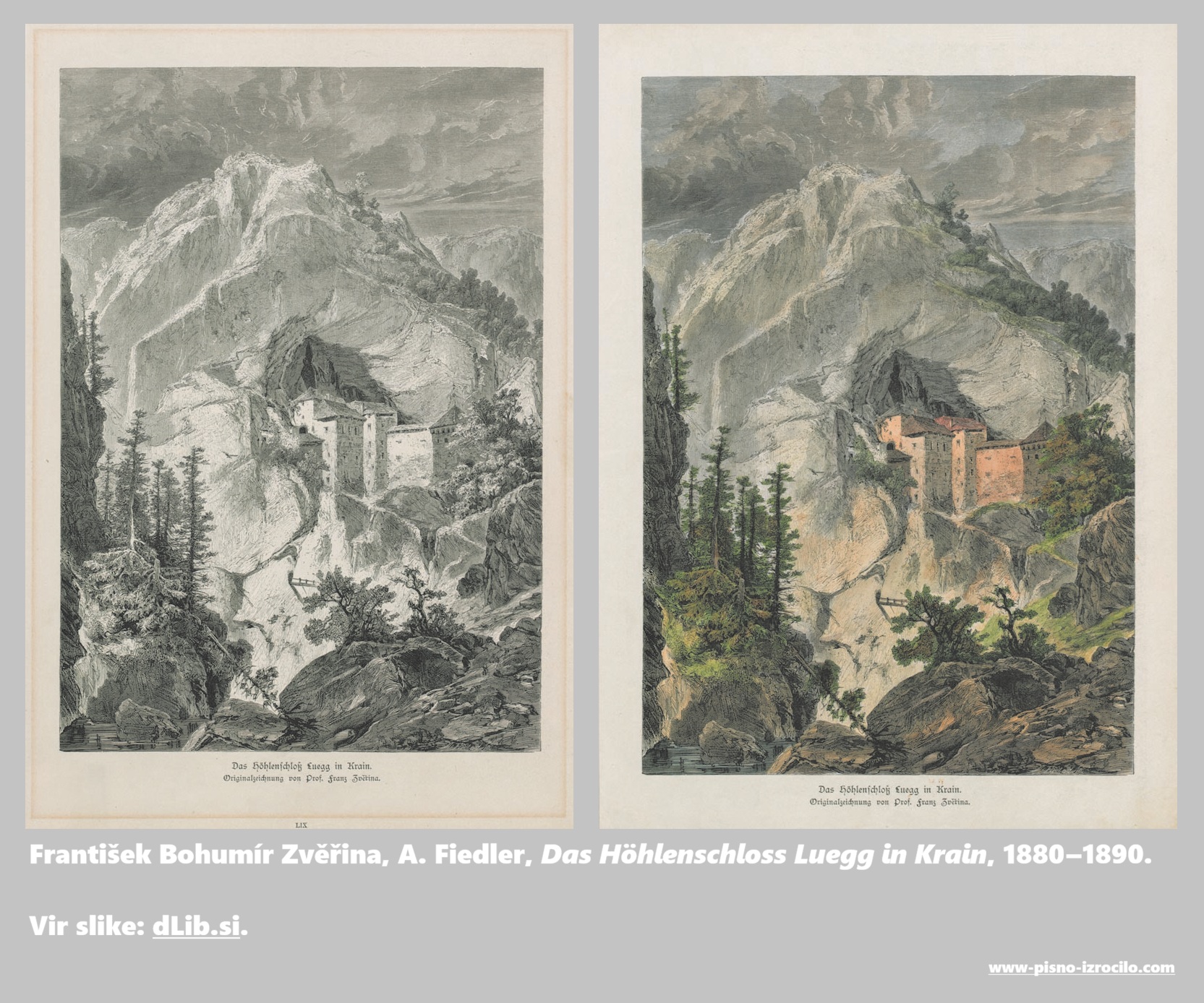 - František Bohumír Zvěřina, A. Fiedler, Das Höhlenschloss Luegg in Krain, 1880–1890, https://www.dlib.si/?URN=URN:NBN:SI:IMG-N4CVV5MX.