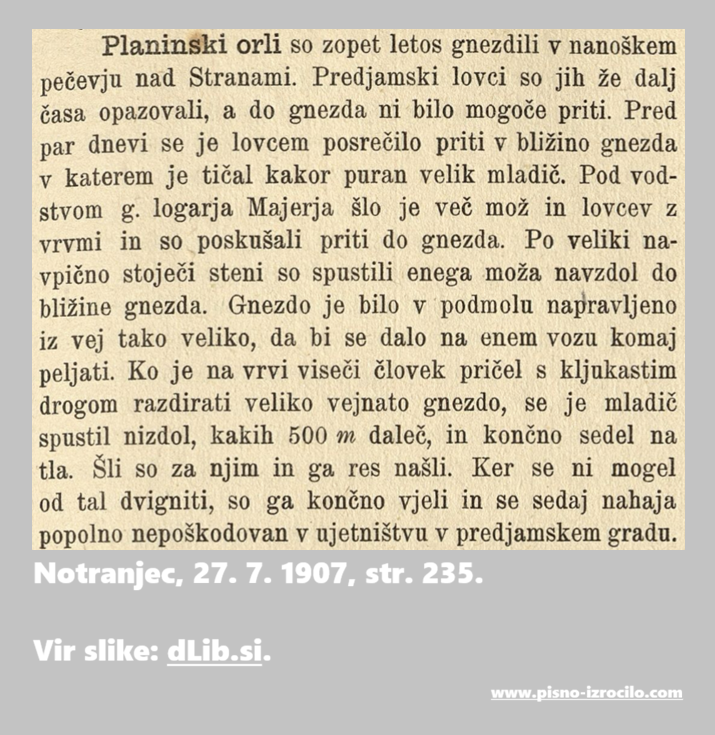 Erazma in Luegarje so večkrat primerjali z roparskimi pticami, ki so gnezdile visoko v jamski votlini. Ta je seveda tudi dom pravih ptic. V Notranjcu pa je bila leta 1907 objavljena novica o mladiču planinskega orla, ki so ga rešili in nato nastanili v Predjamski grad. Očitno je bila to zelo odmevna novica, saj sem jo – v isti obliki – tega leta zasledila še v vsaj petih drugih časopisih, tudi v takih za Slovence v tujini.