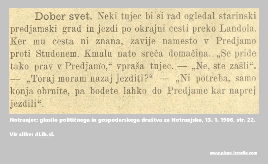 Ko sem želela poiskati stare vire o Predjamskem gradu ali gradu Lueg, sem (ob fizičnih knjigah) tako »zavila« tudi na dLib. Kar zadeva večnost (ali na drugi strani pozabo): nekatere knjige so resda kanon – Valvasor, Pohlin, Vodnik so trden gradnik kulturne tradicije. Ob pregledovanju gradiva na dLib pa se slej ko prej zavemo, da to, da je besedilo zapisano in tiskano, tega še ne reši enostavno pred pozabo. Produkcija denimo časopisnih prispevkov je bila že v 19. stoletju znatna, publikacij pa ne malo. Na koliko biserov naleti človek, ko brska že po naključno izbrani številki. Jezik, ton besedila, opisane teme, dogodki – vedno zanimivo branje. A po naravi stvari je tako, da tudi skrbno pripravljeni prispevki, morda nekoč množično brani, sčasoma zbledijo. Oteti jih pozabi je zato lahko lep, četudi le ljubiteljski projekt. Nečesa takega se lotevam z današnjim prispevkom.