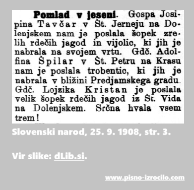 - Slovenski narod, 25. 9. 1908, https://www.dlib.si/?URN=URN:NBN:SI:DOC-4T8KCDH4.
